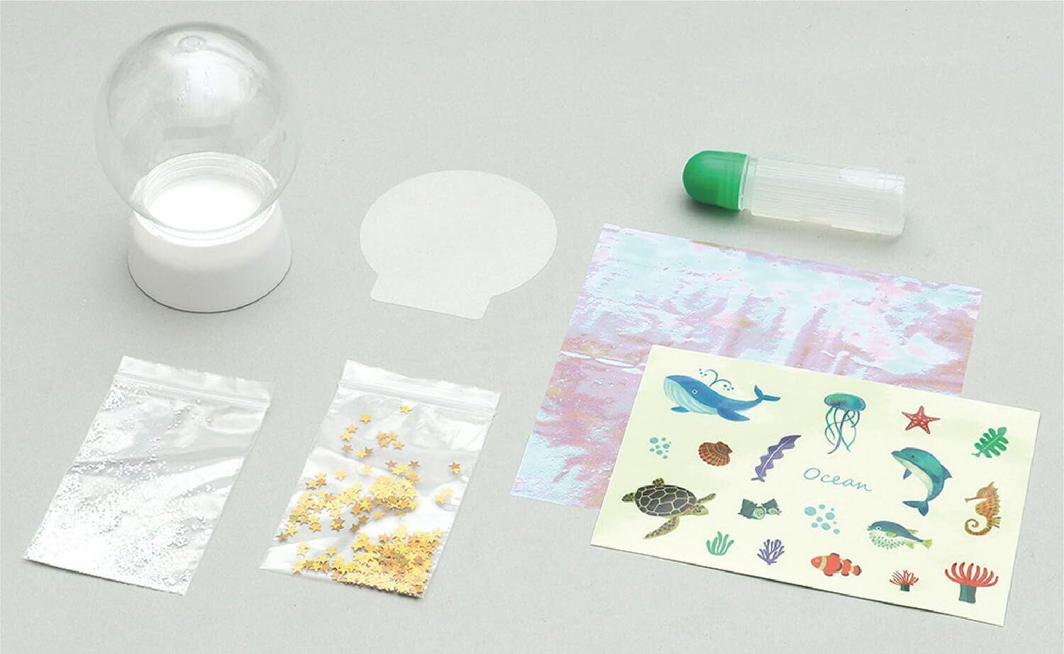 ●セット内容:スノードームボトル、防水シート、デザインシート、海の生き物シール、ホログラムグリッター(星)、オーロラフィルム。