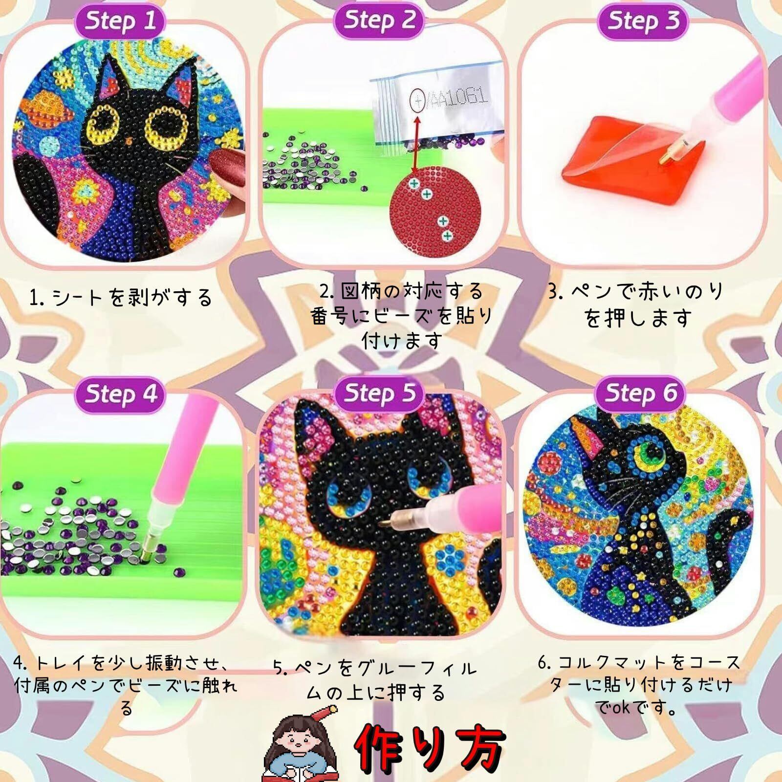 【初心者や子供ご心配なく】コースターの番号に対応するダイヤモンドをトレイに注ぎ、コースターを覆っているフィルムをはがし、コースターの番号に合わせて対応するダイヤモンドをコースターに貼り付けます。最後にコルクマットをコースターの裏側に貼り付けると、ユニークで美してわいい猫コースターが出来上がります