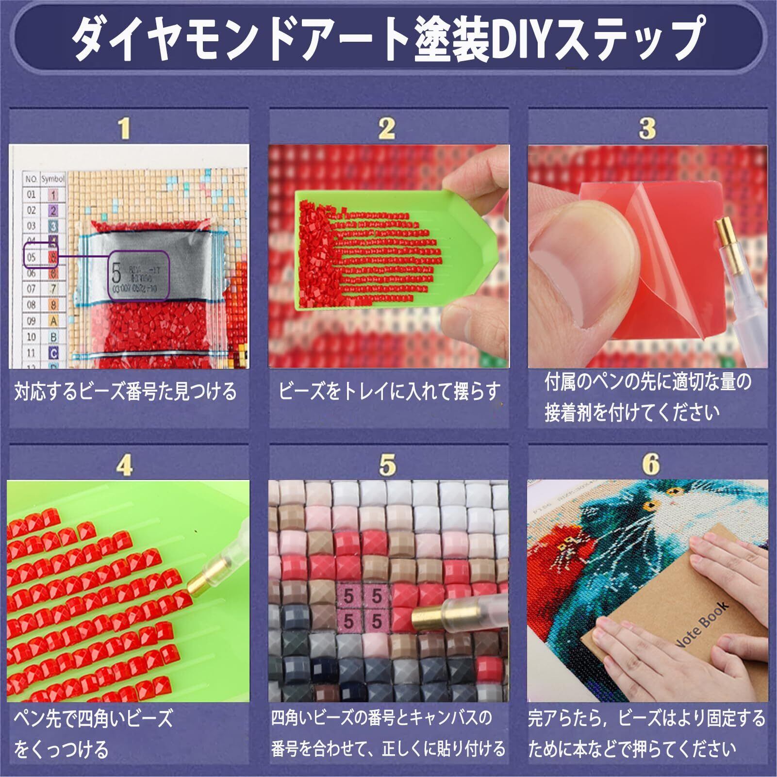 ・【全面貼り付けタイプ】: 四角いビーズを使用した全面貼り付け式のため、初心者でも簡単に美しいアート作品を作り上げることができます。必要な道具もすべてセットになっているので安心して始められます。