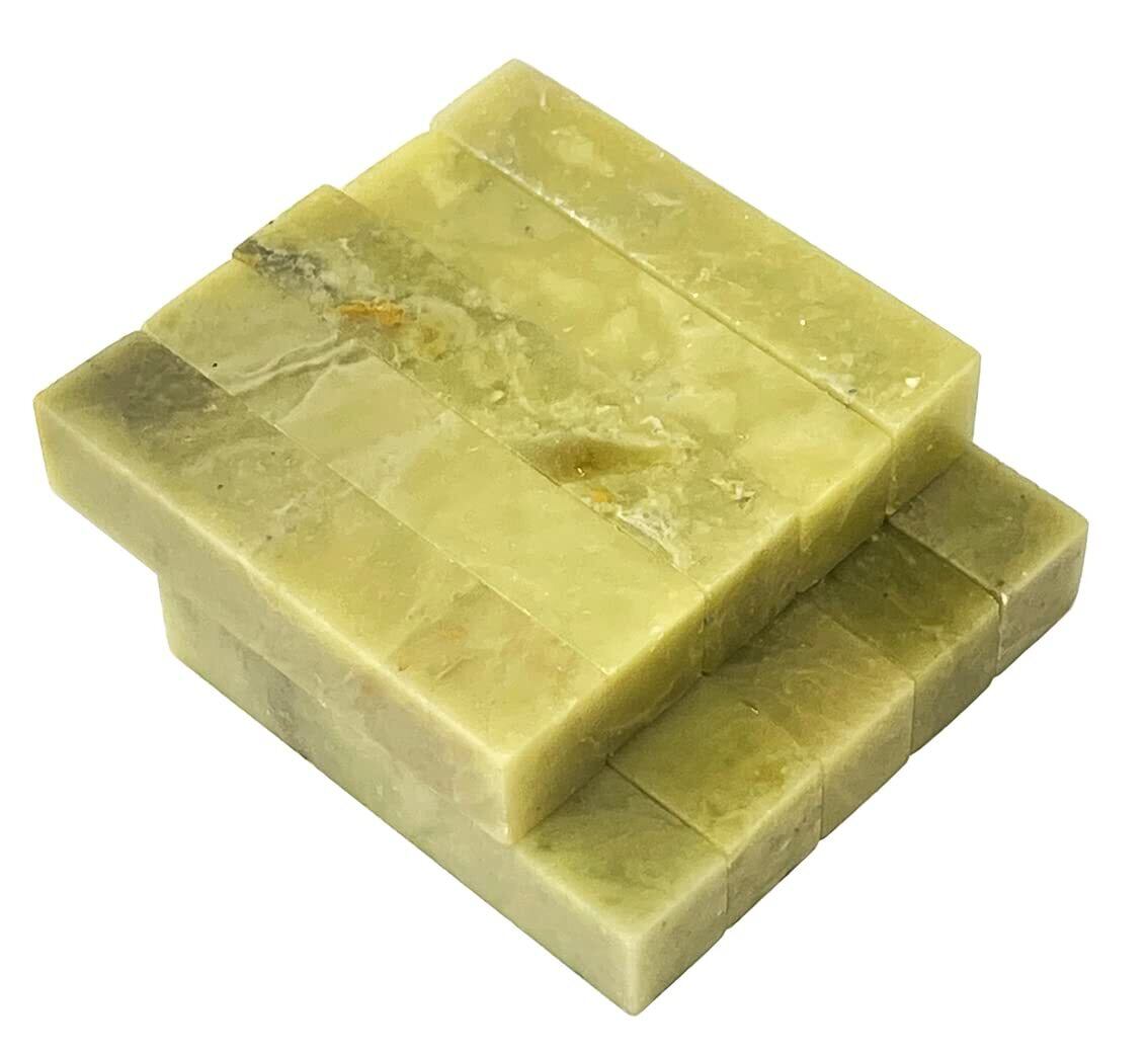 【印材サイズ 約10×10×50mm 10個セット】書道や水墨画、絵手紙作品の雅号印制作に最適な篆刻初心者でも彫りやすい印材です。彫る前に印面を耐水ペーパーで滑らかにしてお使いください。薄緑色の印材で、印材としての歴史も古く、現在も広く使われています。青田石は、「ひび割れ」が発生しております。また、天然の石印材ですので、石質には個体差があります。印刀が入りにくい硬い粒状のものが混入している場合もあります。予めご了承をお願い致します。また、キズ、欠け、歪み等がある場合があります。その際は紙やすり(耐水ペーパー)を利用して修正のうえお使いください。