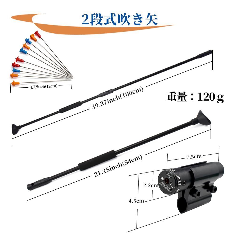 【取り外し可能】:スポーツ吹き矢用具の全長は39.37 inchで、2本のダーツクイバーとマウスピースから構成され、全体が取り外し可能で、一本のダーツクイバーの長さは18.1 inch/46 cmで、必要に応じて2種類の長さのダーツを体験できます。