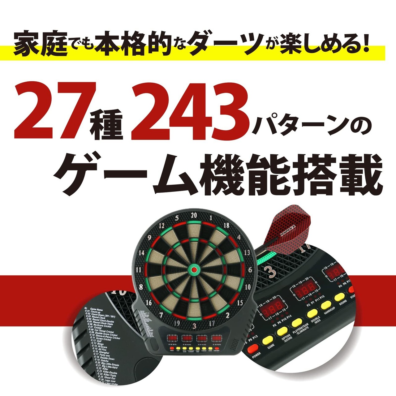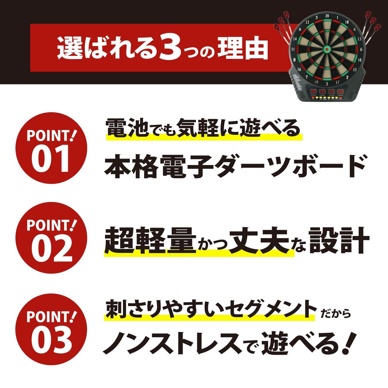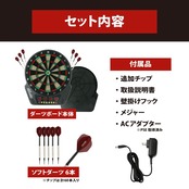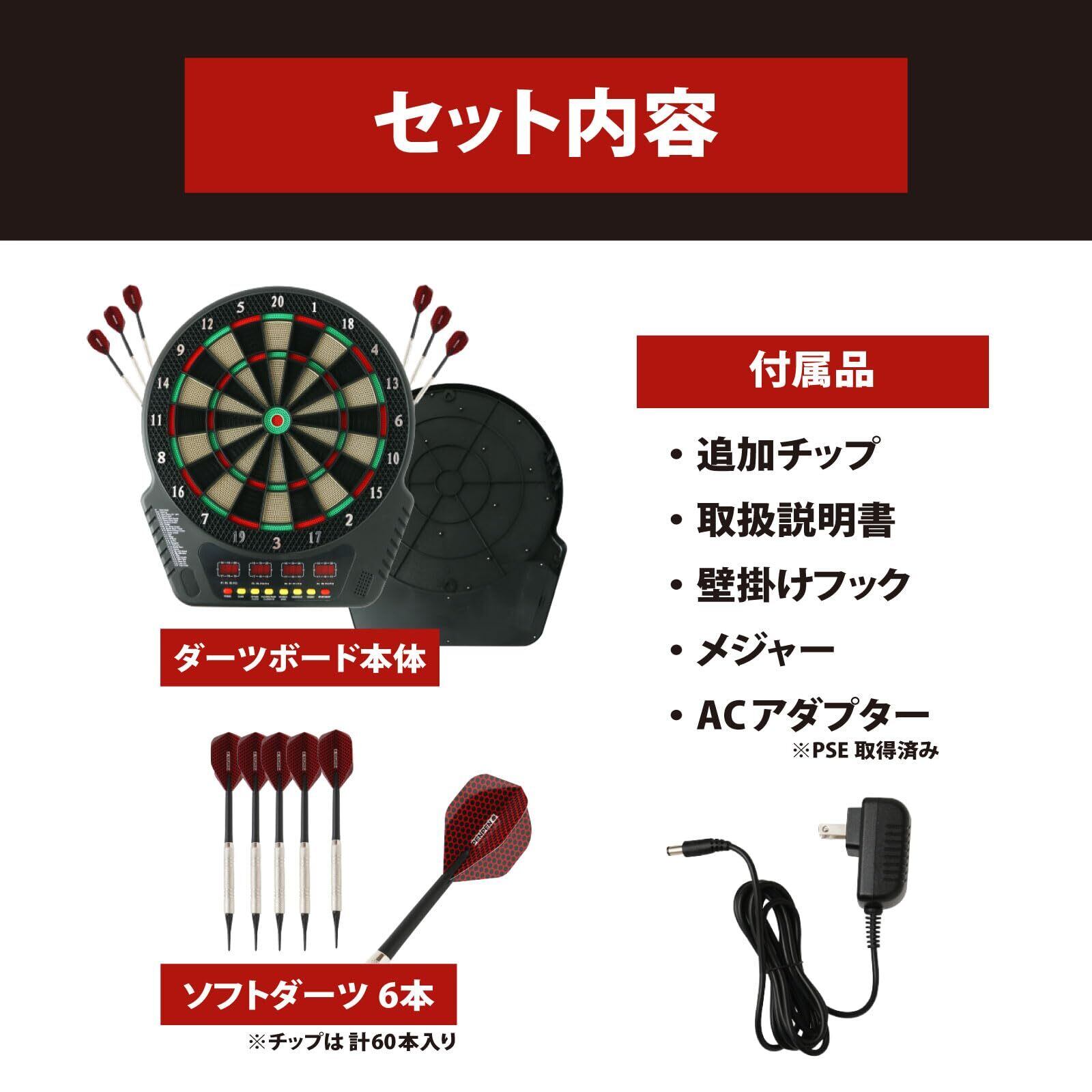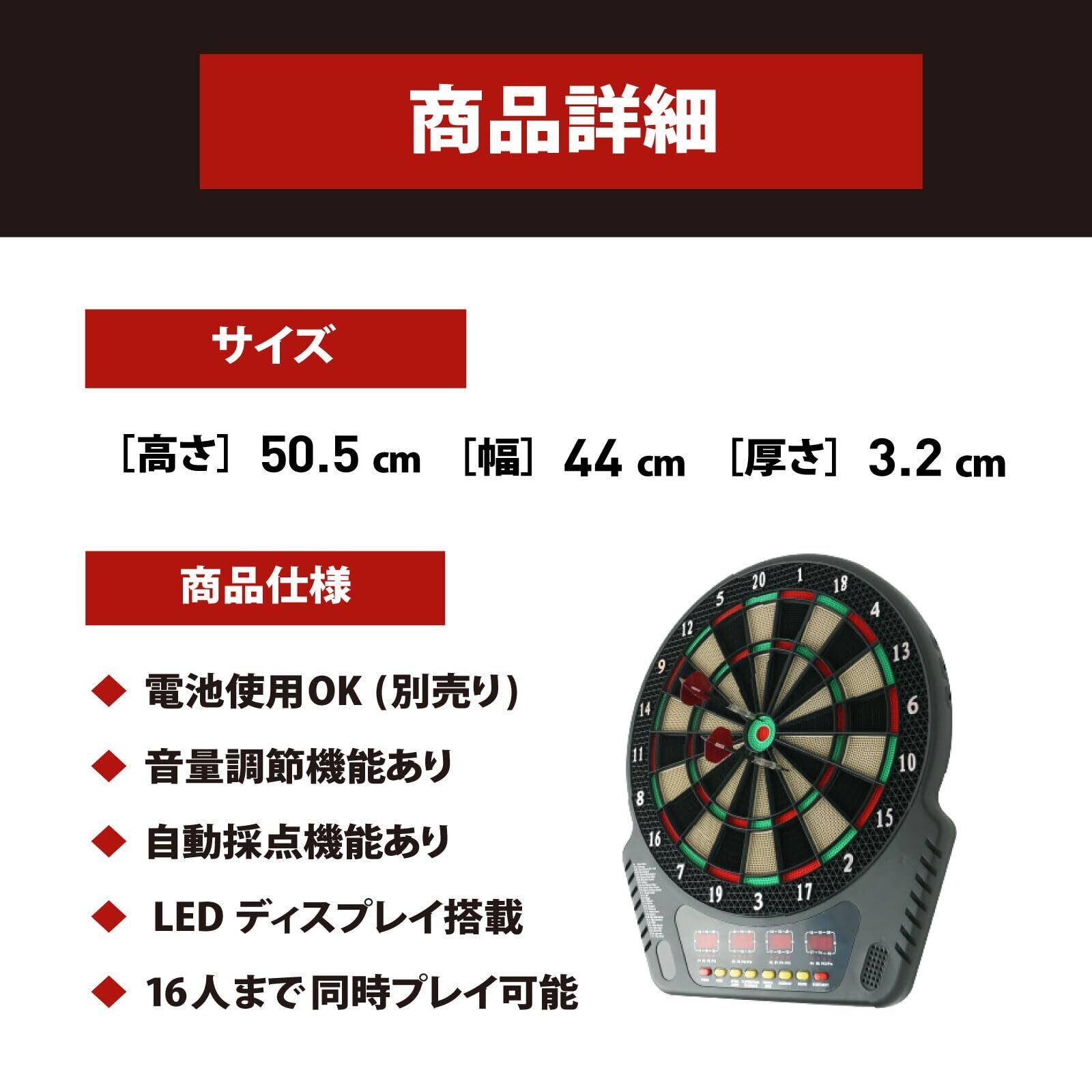 【商品詳細】 [サイズ]幅44x高さ5.5x厚み3.2(cm) [ゲームエリア]33cm[重量]約1.7kg [付属アクセサリー]ダーツ矢×6セット(フライトシャフト・バレル各6個/チップ×60個)・壁掛けフック×2・日本語取扱説明書×1 ・ACアダプター(PSE取得済み)※フライトのデザインは変更になる場合がありますので予めご了承ください。 [使用電池]単3電池4本使用(別途お買い求めください)