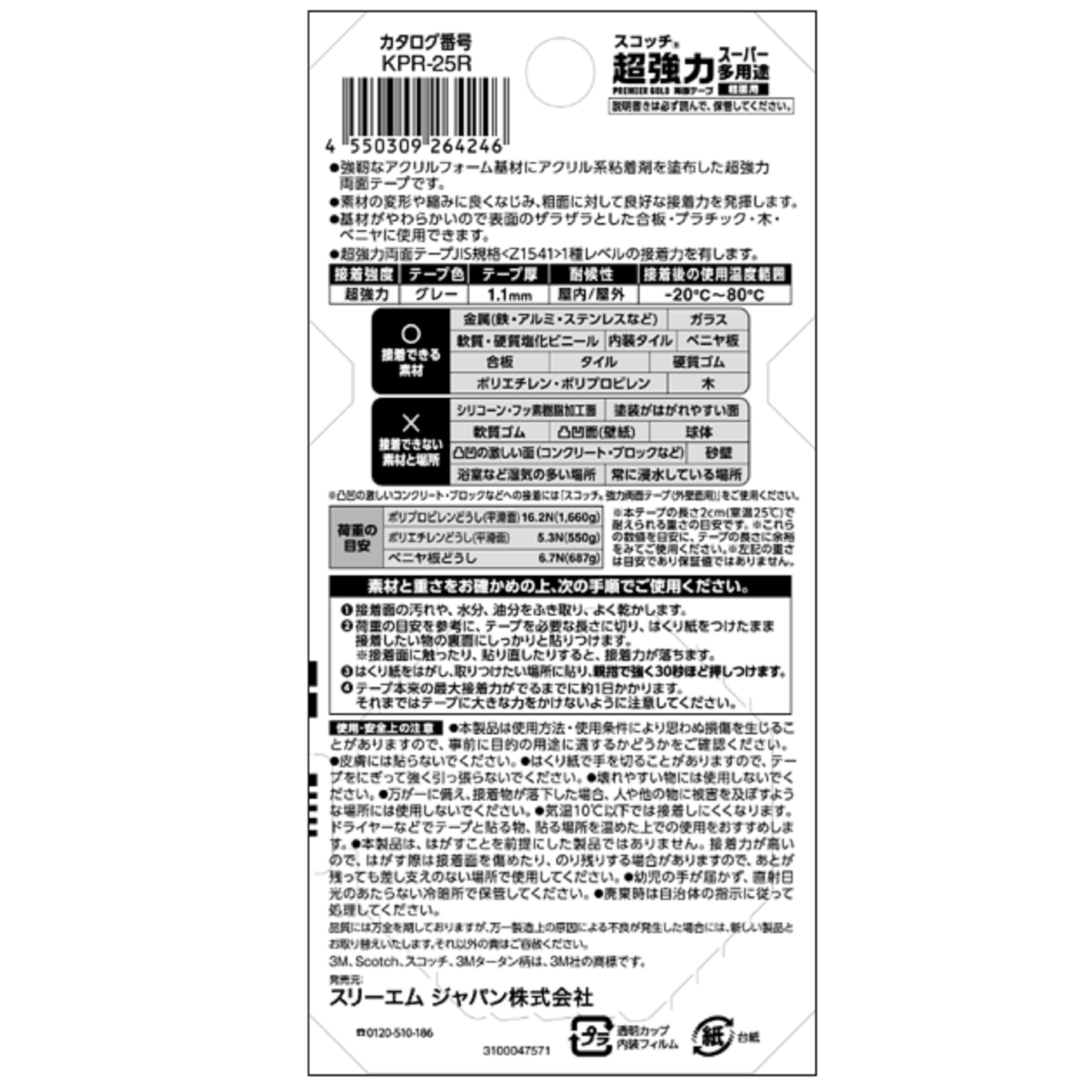 【特価セール】3M スコッチ 超強力両面テープ プレミアゴールド スーパー多用途 粗面用 幅25mm長さ1m KPR-25R