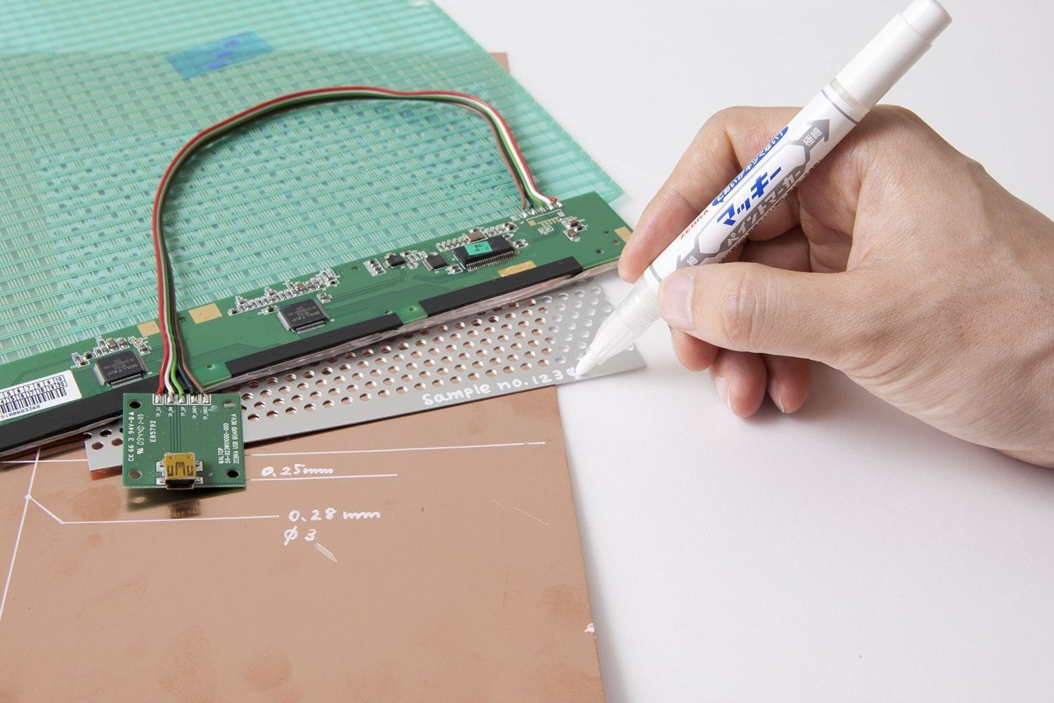 黒いものにもはっきりと書ける、不透明インク。屋外の土木作業現場での木材・土木資材へのマーキング、生産作業現場での金属部品への筆記にも最適