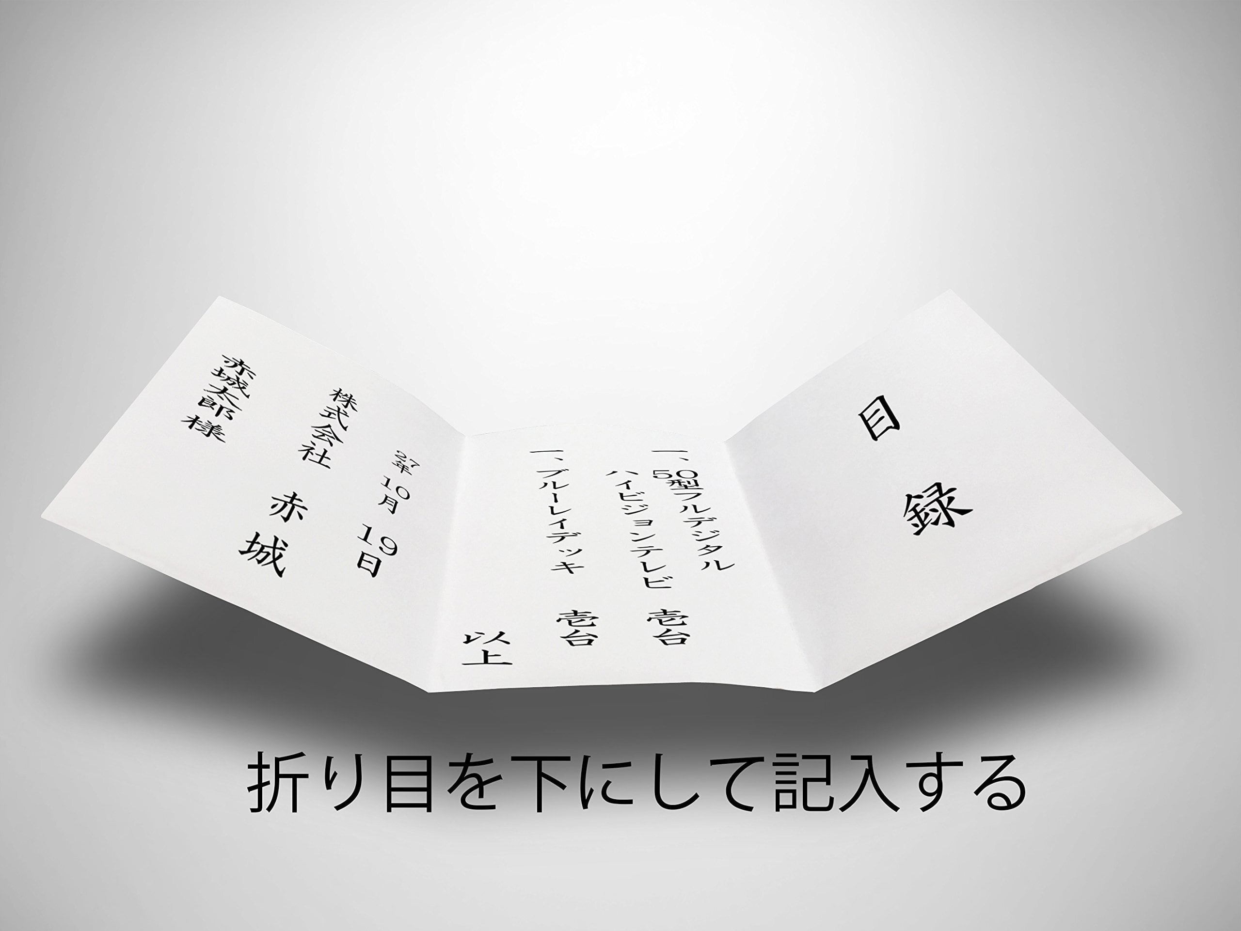 書き方の一例として、右のマスに目録とし、中央に品名、左に年月日と社名や氏名などを記入。用紙のサイズは19.7×39.4センチ。使用方、用途などはこれに限らず、地域・風習に合わせ使用する。