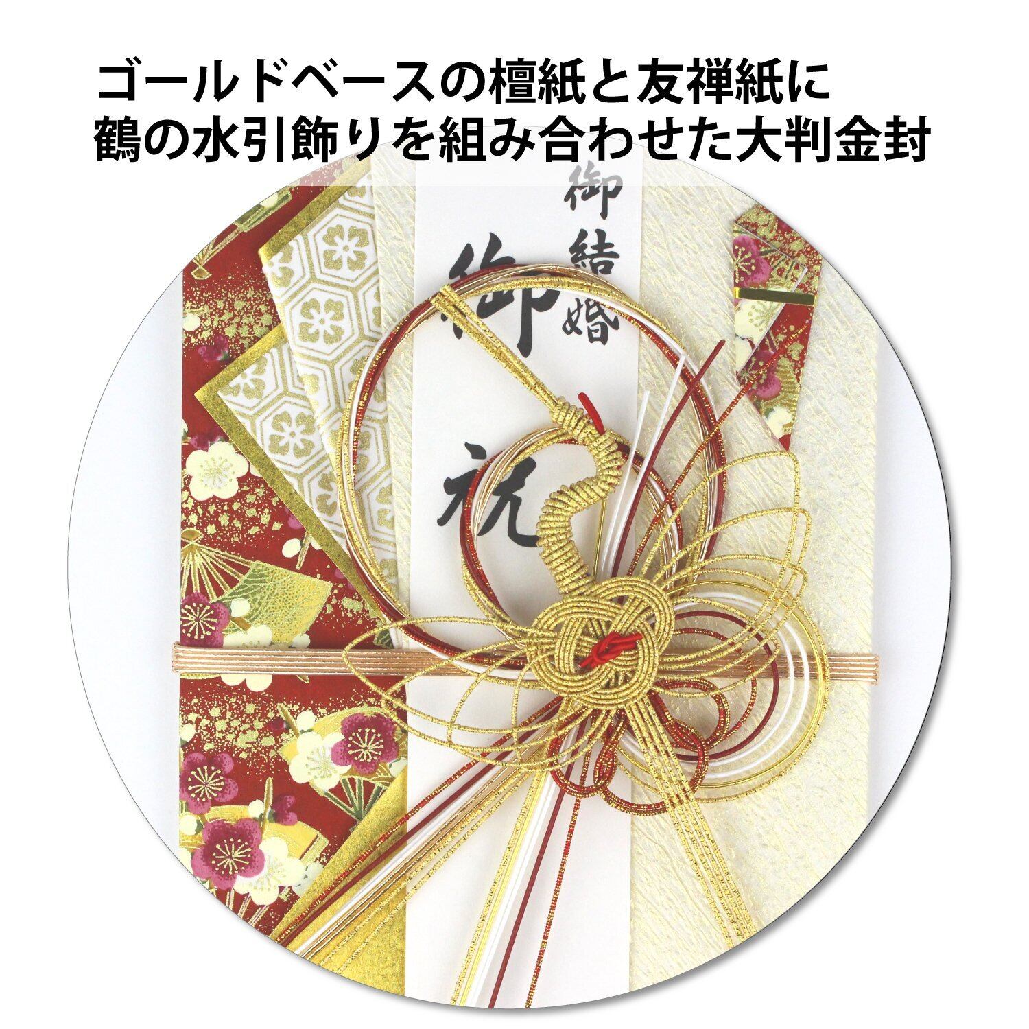 ゴールドベースの檀紙と友禅紙に鶴の水引飾りを組み合わせた重厚感のある大判金封です。
